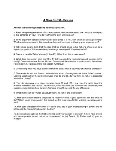 A Hero By R K Naryan Edexcel Extract Teaching Resources - Assistance the hero needs some help, probably from someone older