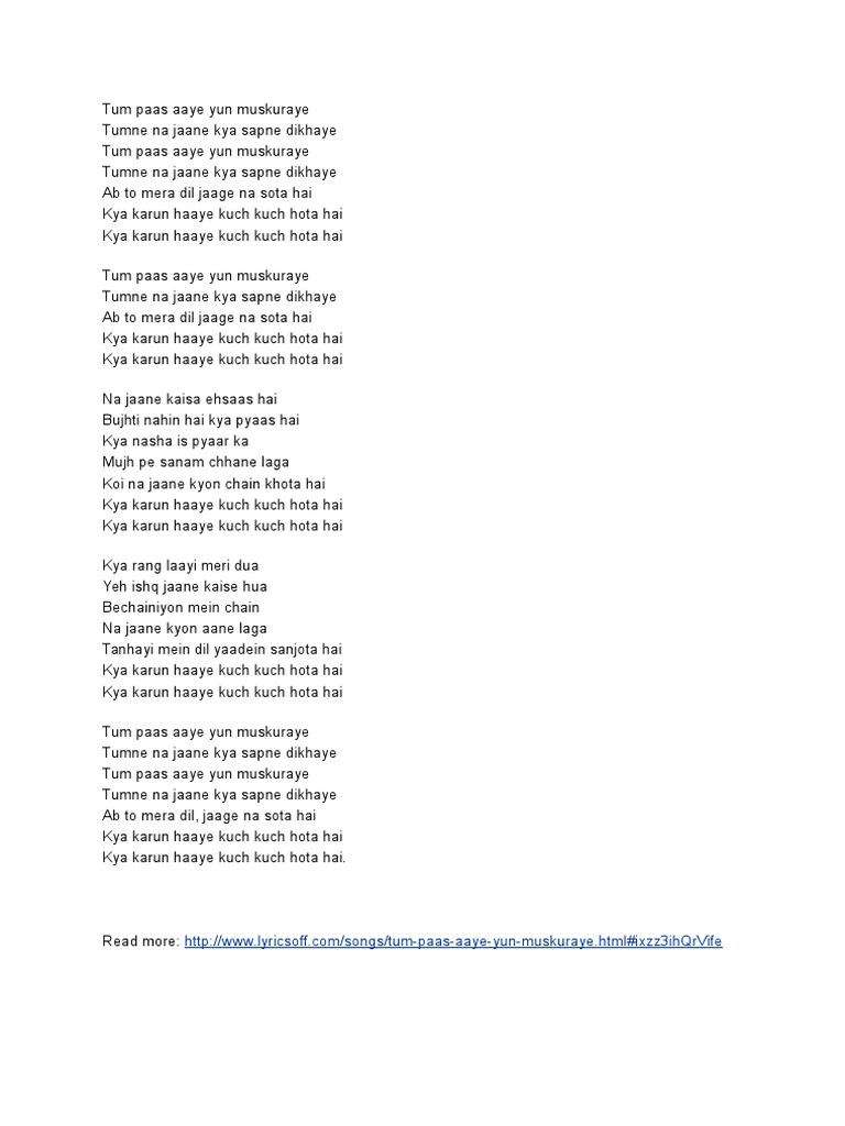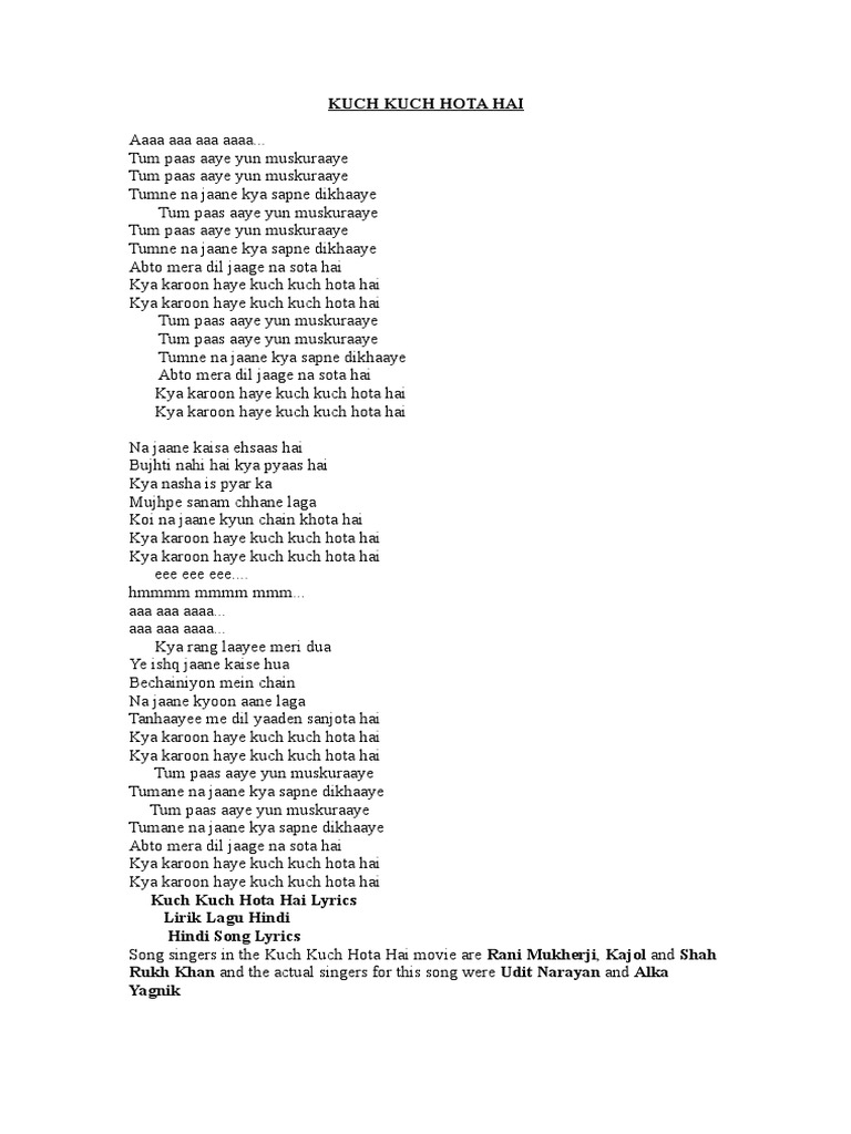 Kuch Kuch Hota Hai Song Lyrics In English - Kuch kuch hota hai (original motion picture soundtrack). Kuch Kuch Hota Hai Song Lyrics In English / The title song lyrics of 'kuch kuch hota hai', starring shahrukh khan, kajol and rani mukherjee.